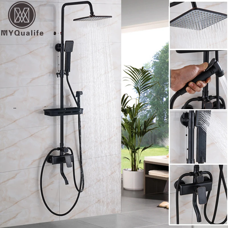 Comprar Parede preta Montada 8 \"Rain Shower Faucet Mixer Set com Commodity Prateleira Do Banheiro Banheira Bica Giratória Mão ducha Bidê Pulverizador Baratas Online Preço