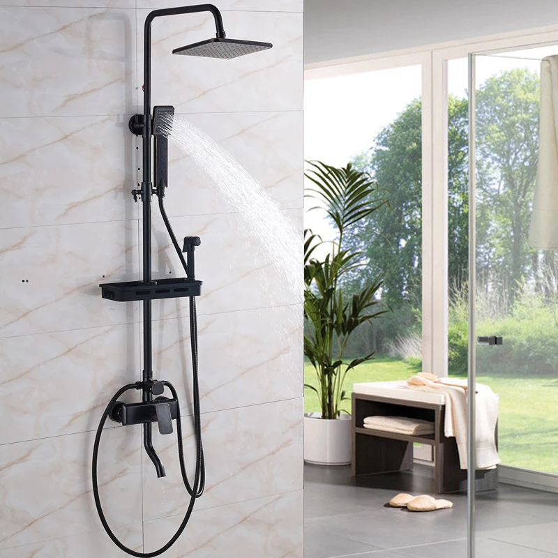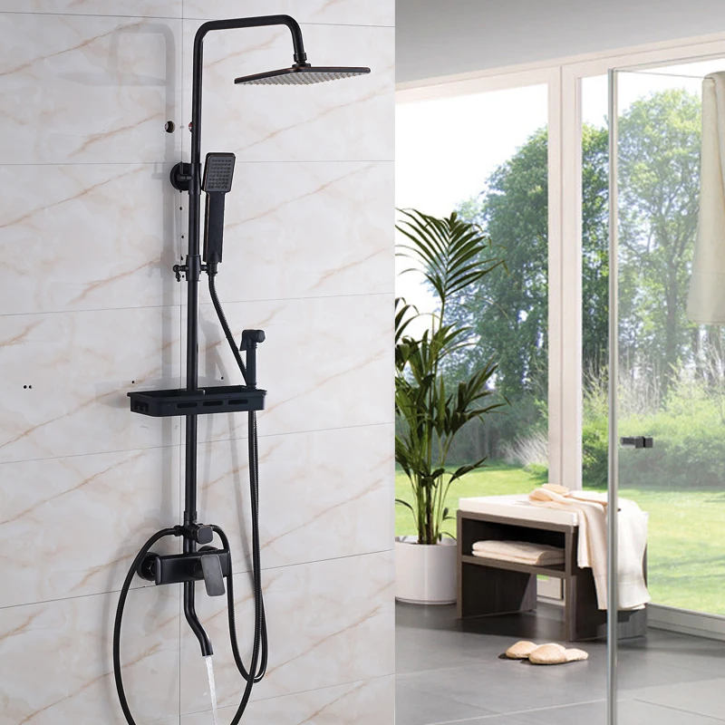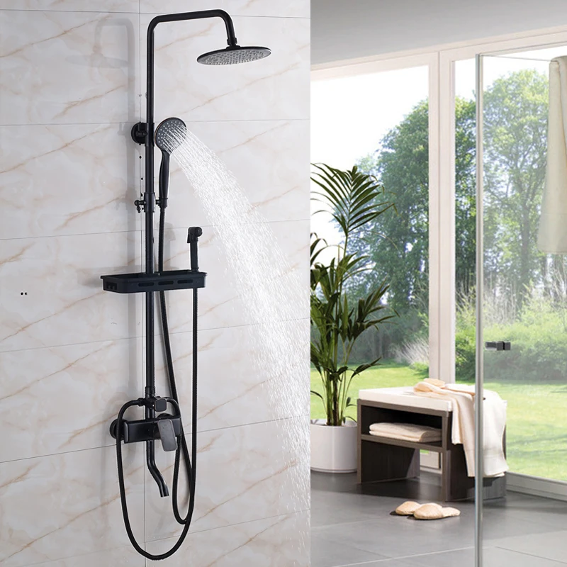 Comprar Parede preta Montada 8 \"Rain Shower Faucet Mixer Set com Commodity Prateleira Do Banheiro Banheira Bica Giratória Mão ducha Bidê Pulverizador Baratas Online Preço.