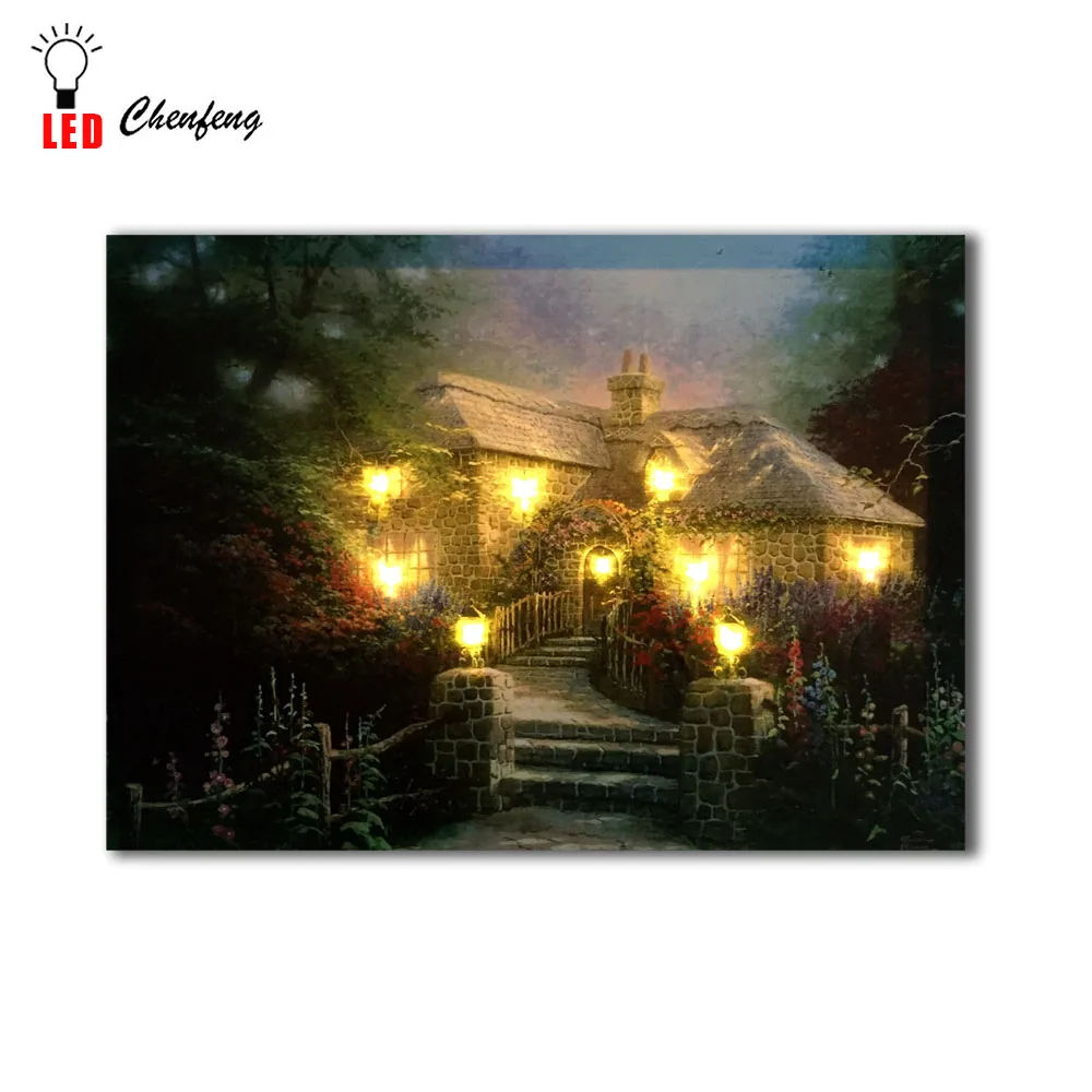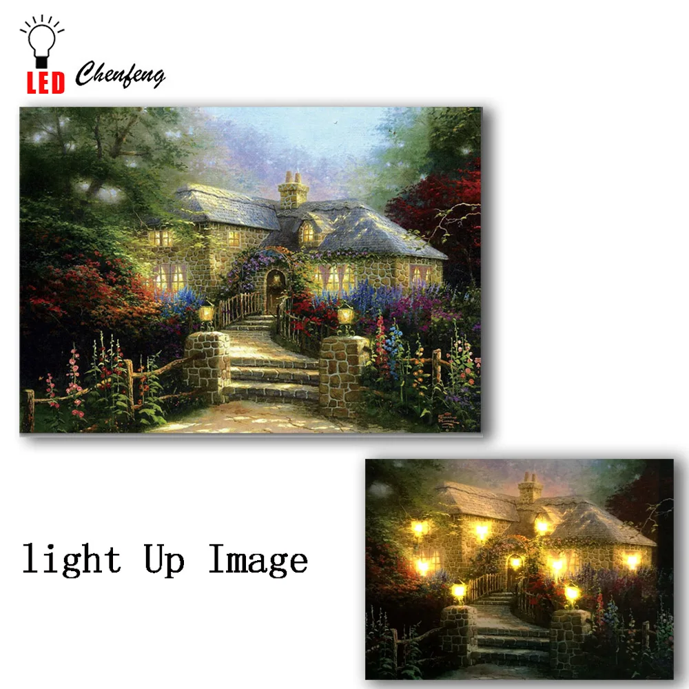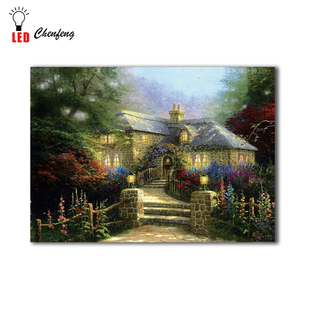 Comprar Led iluminado jardim do Castelo de Conto de fadas flor pintura a óleo do retrato da parede impressão da lona da parede da lona de arte casa decoração sala de estar Baratas Online Preço