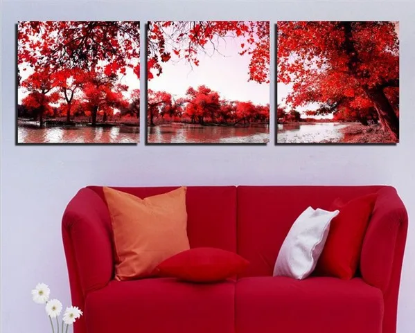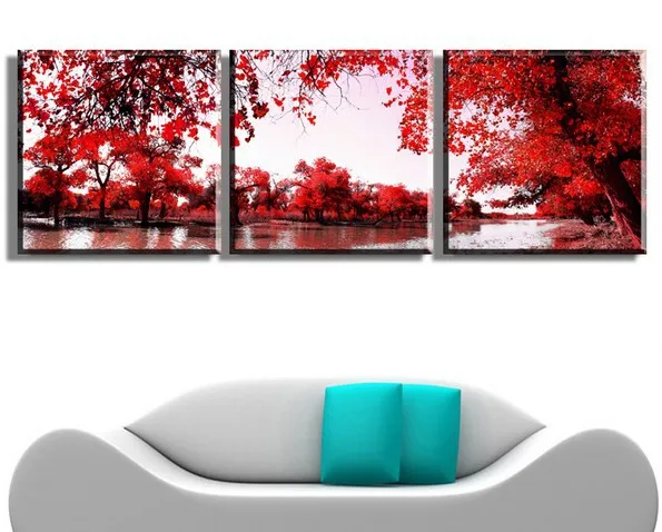 Comprar 2015 de Alta Qualidade 3 peça da Arte Da Parede Da árvore vermelha lago Pintura A Óleo Da paisagem Na Lona impressão colorida Pintura abstrata Pictures decoração Baratas Online Preço.