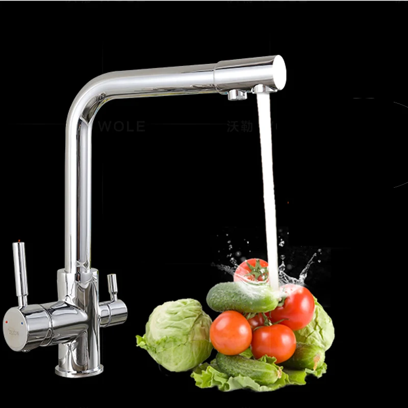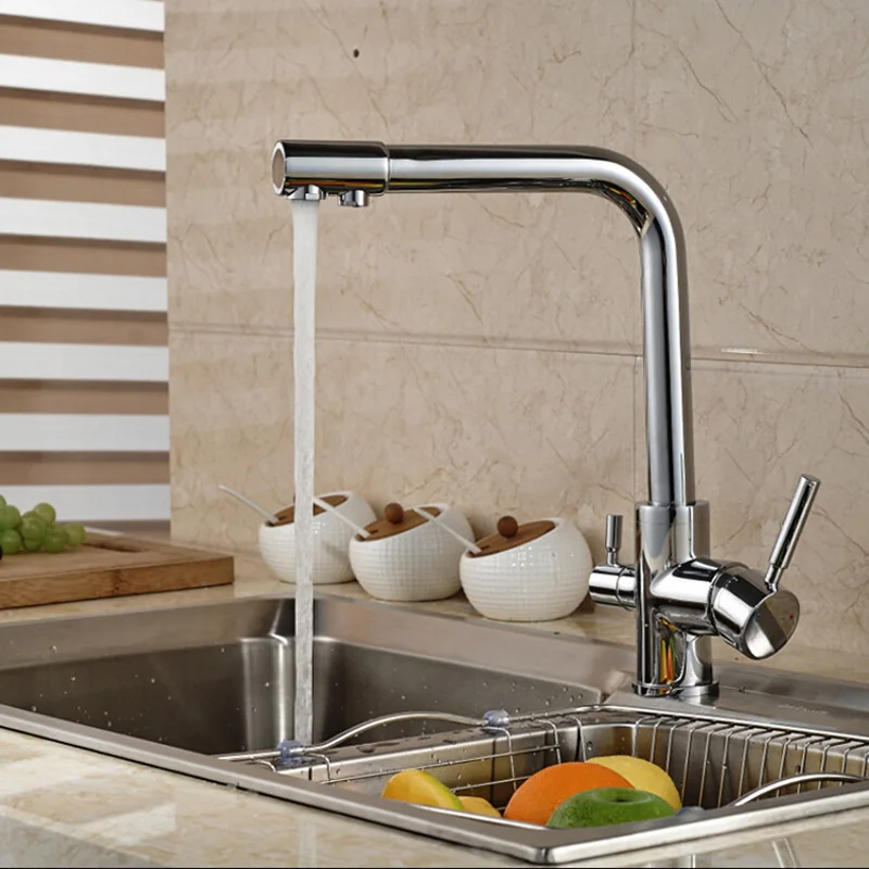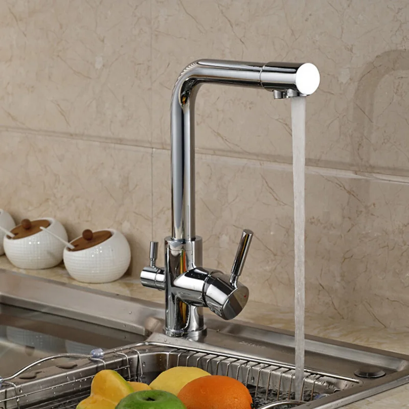 Comprar Luxo em Latão Cromado Torneira Da Cozinha Dupla Alça de Água Pura Potável Quente e Fria 3 way Filtro de Água Misturador Da Cozinha torneiras Baratas Online Preço.