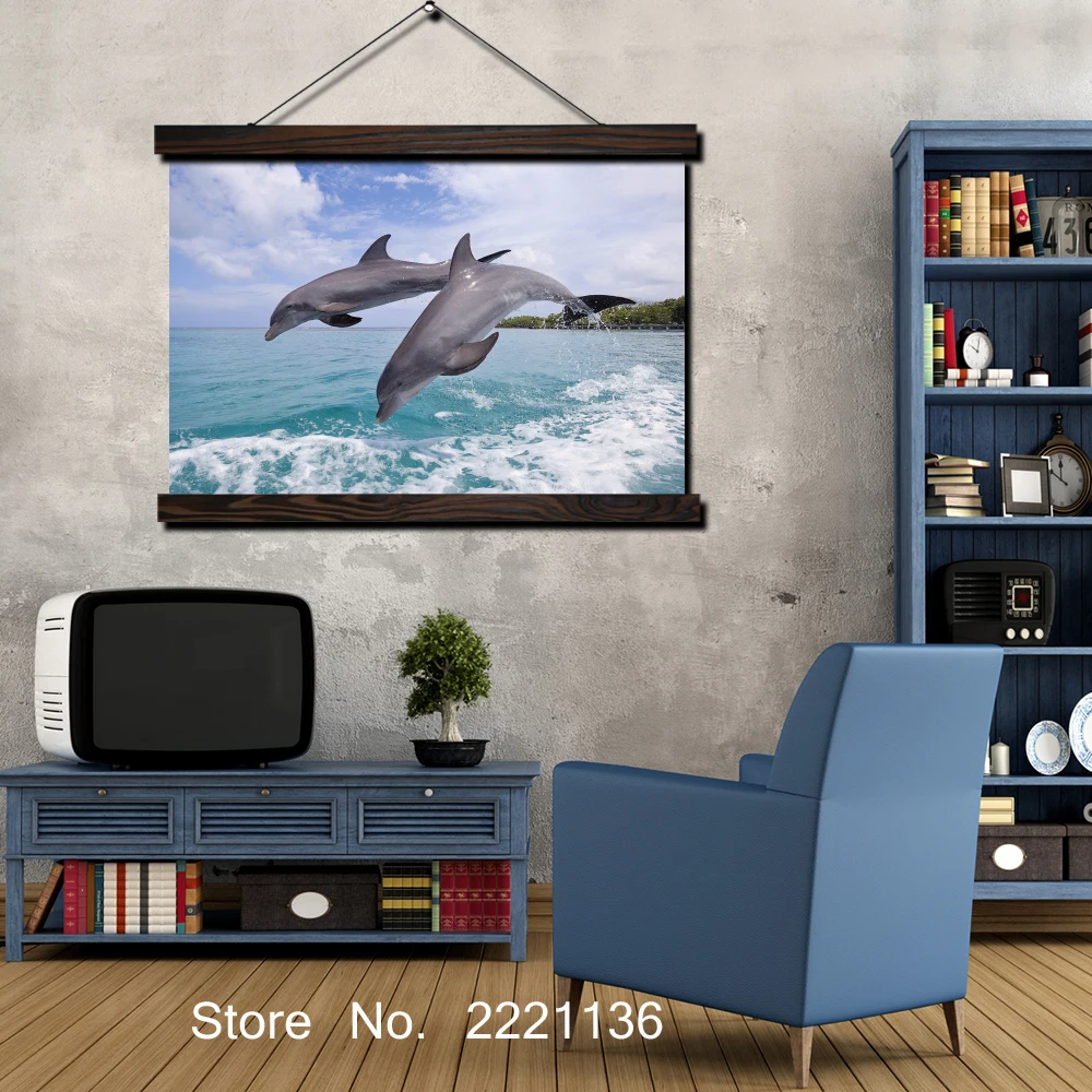 Comprar Dois golfinhos saltar para fora do mar Emoldurado Scroll Pintura Moderna Casa Decoração Da Parede De Suspensão de Obras de Arte em Alta Definição de Impressão Cartaz Baratas Online Preço