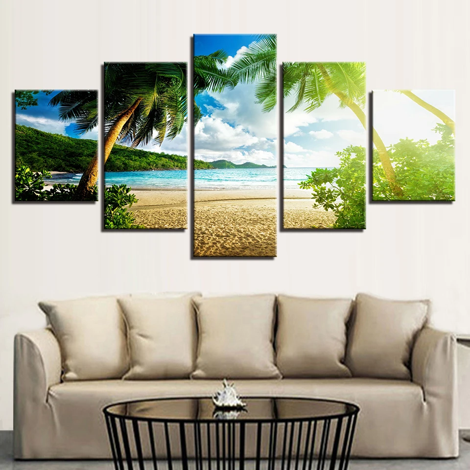 Comprar 5 Peças Céu Azul Praia Palmeiras Seascape Pictures Living quarto HD Imprime Pinturas Da Lona Cartaz Casa Decoração Quadro de Parede arte Baratas Online Preço.