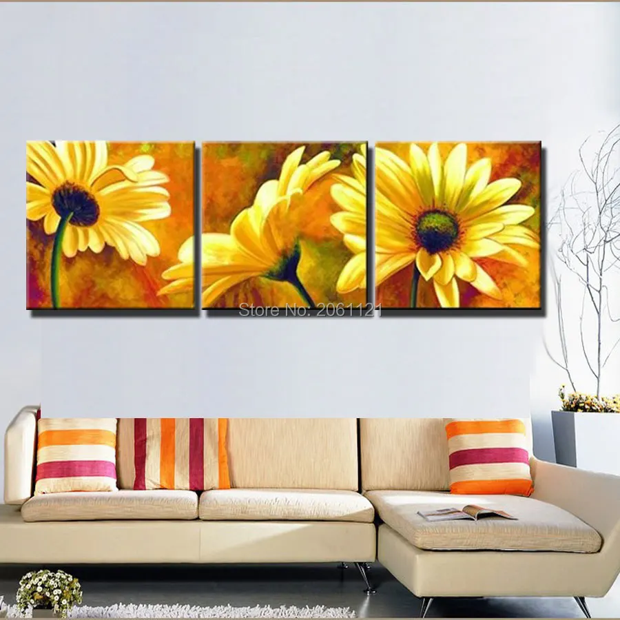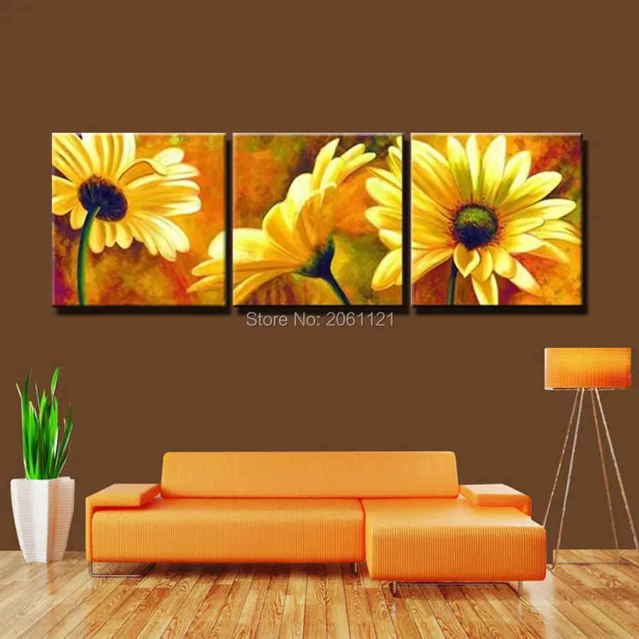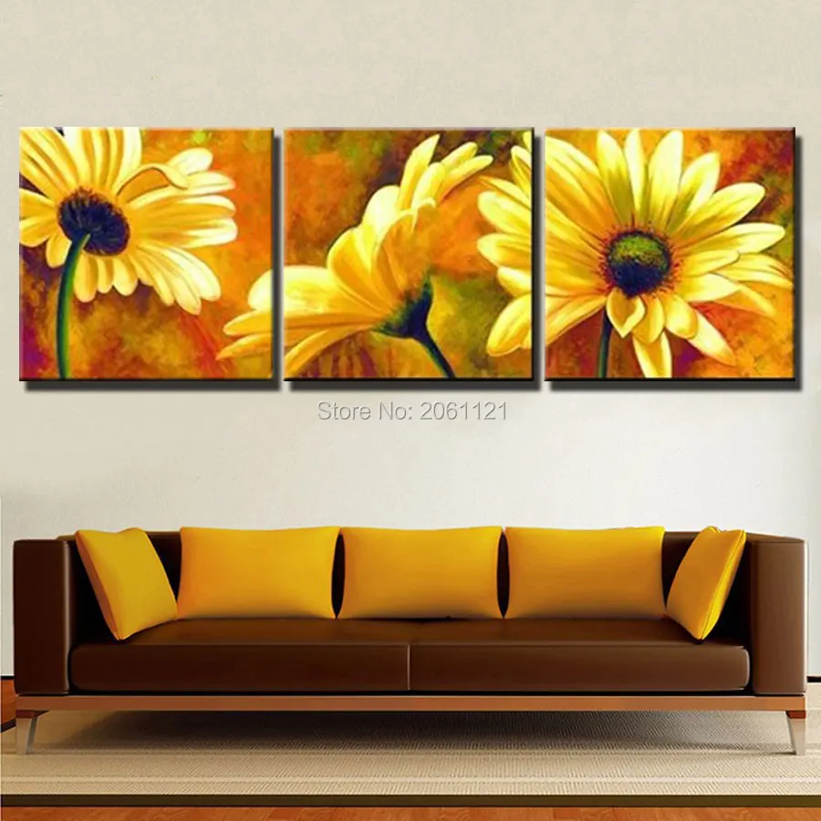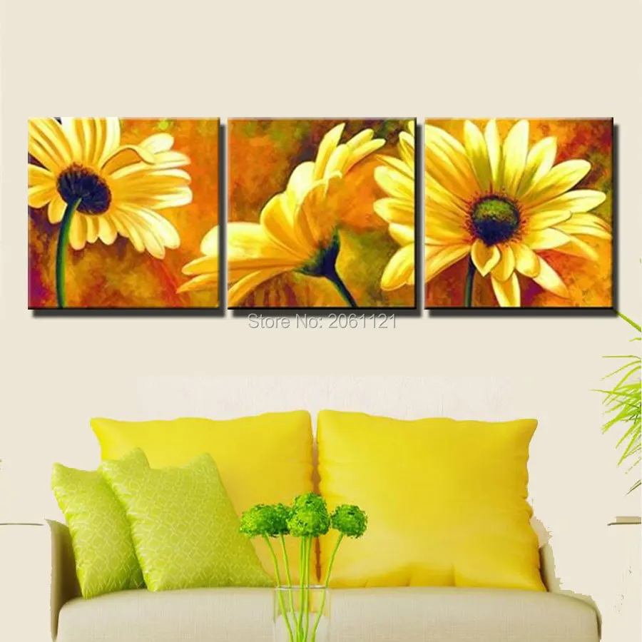 Comprar Imagem da lona pintura a óleo pintados à mão flor amarela 3 peças realistas flores do sol parede pictures para sala de estar decoração Baratas Online Preço.