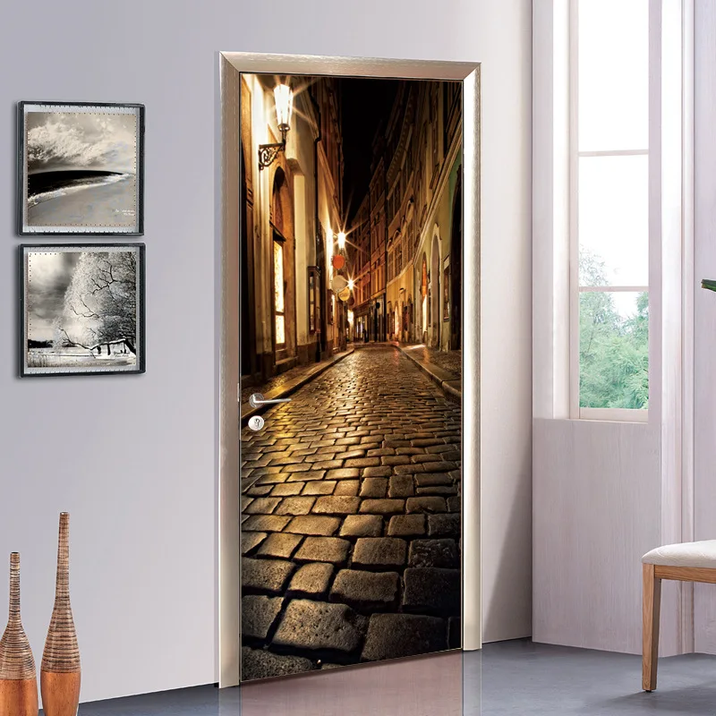 Comprar Portas de madeira Porta Refurbish Adesivo noite rua Auto Adesivo Decorativo Decalque Da Parede Mural Papel De Parede sobre a Porta À Prova D Água Baratas Online Preço.