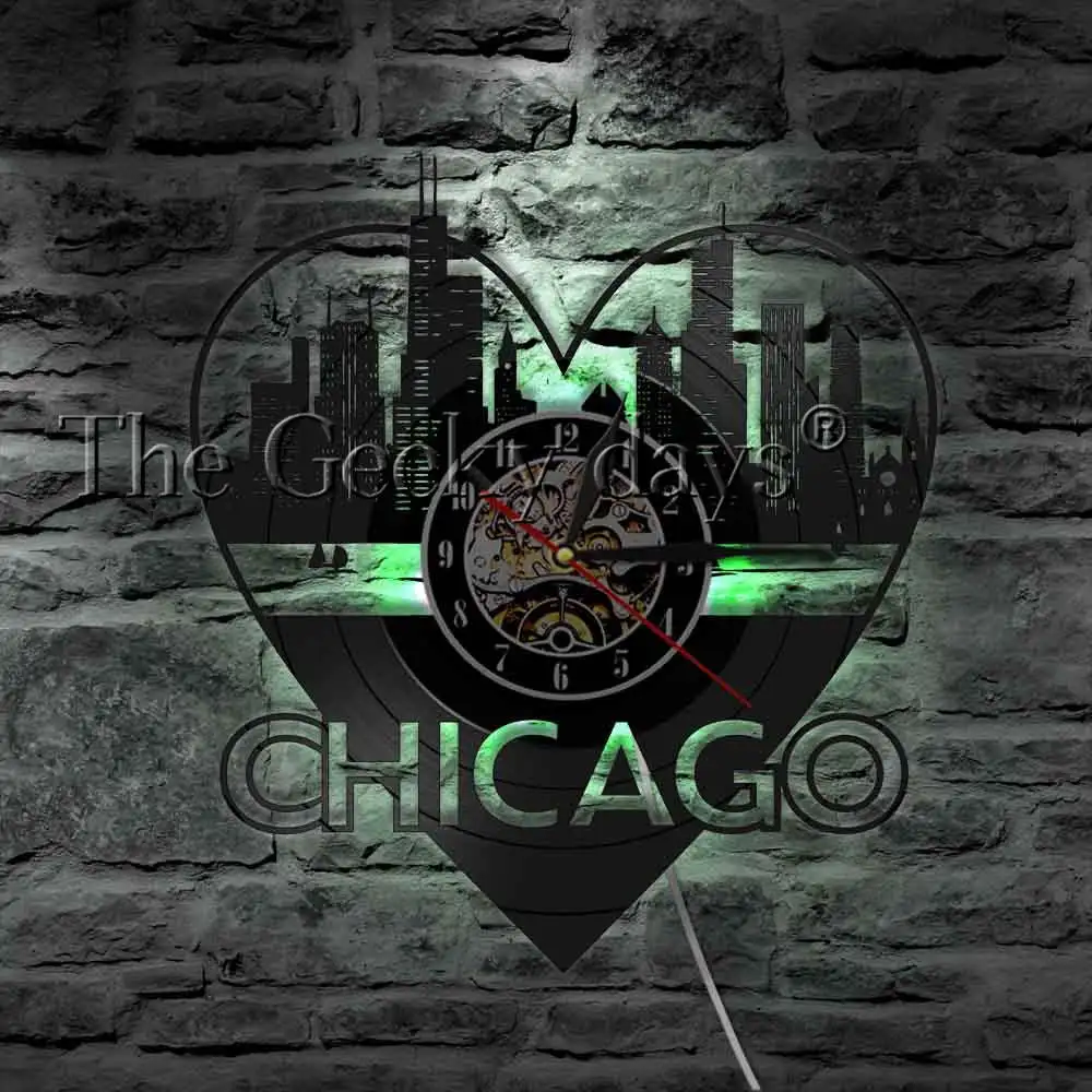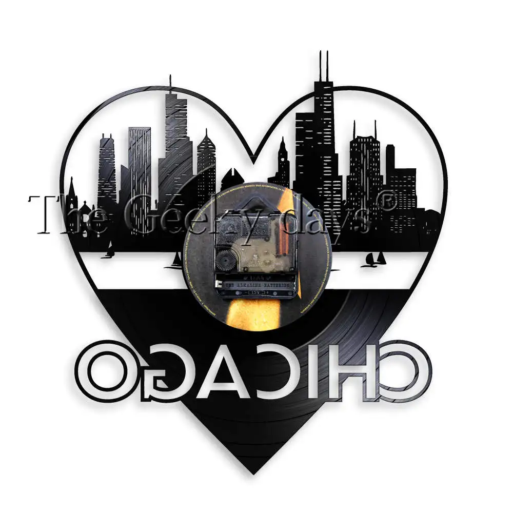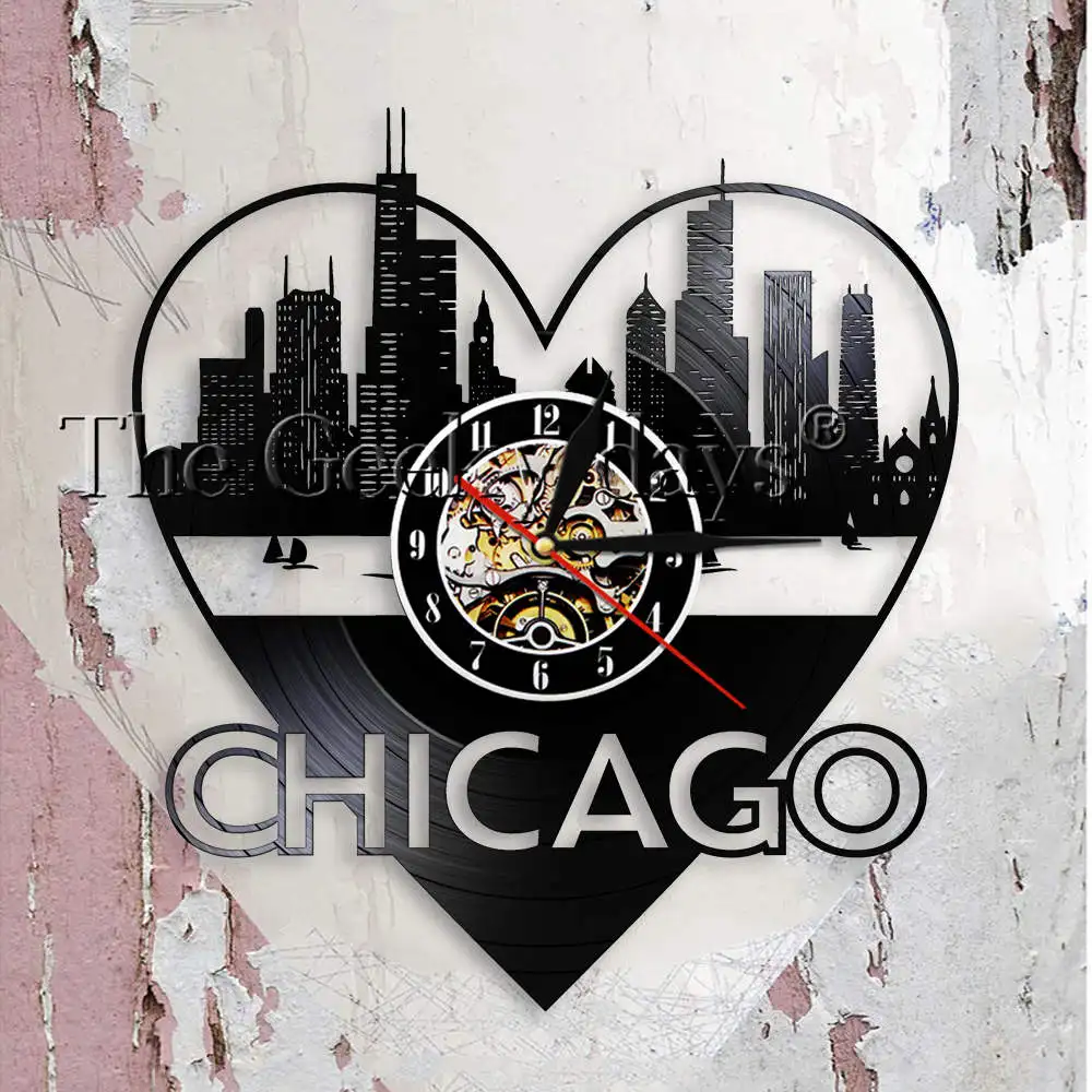 Comprar Chicago City Arquitetura Arte Da Parede Relógio de Parede Relógio de Parede Home Decor Cityscape Chicago Skyline Vinyl Record EUA Souvenir De Viagem Baratas Online Preço.