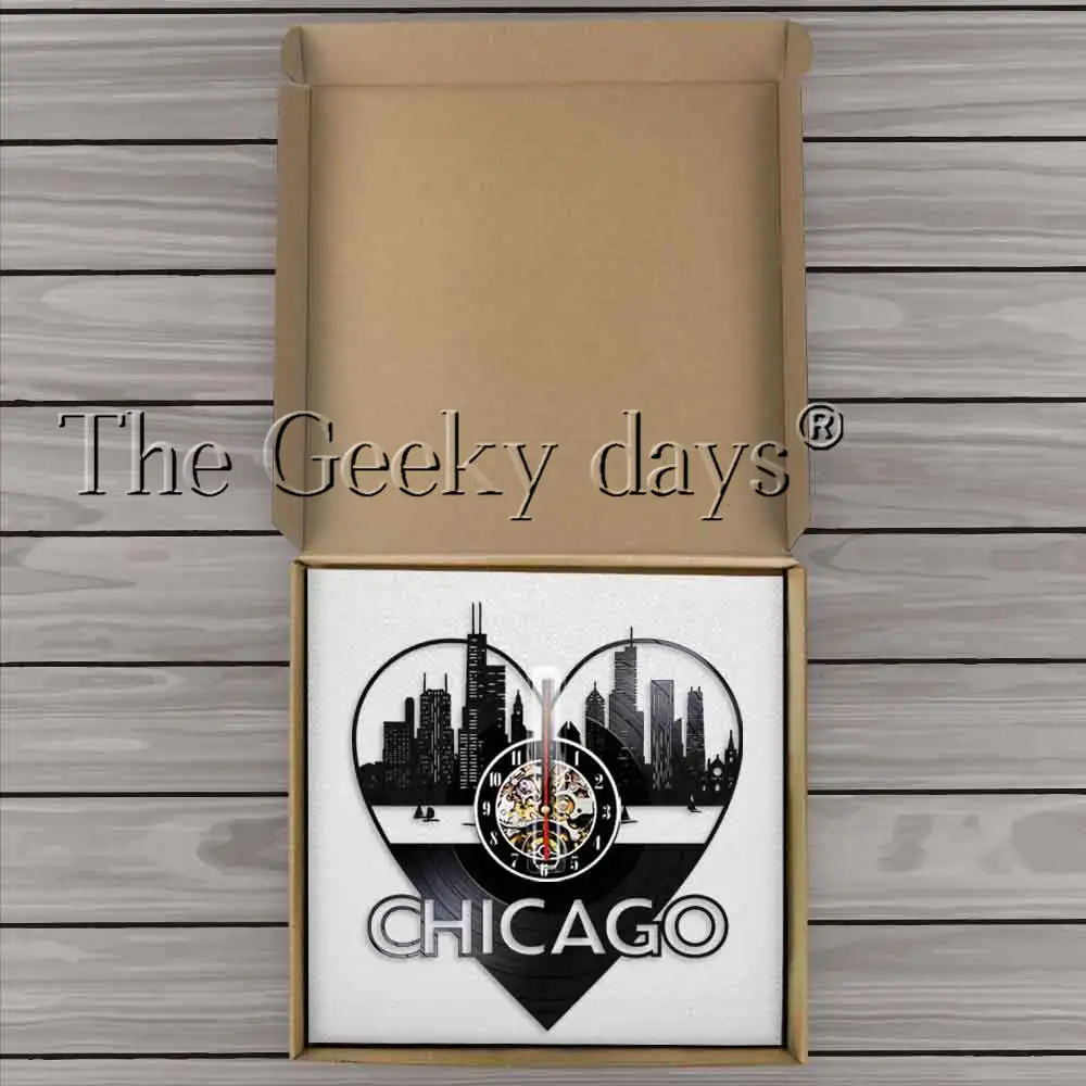 Comprar Chicago City Arquitetura Arte Da Parede Relógio de Parede Relógio de Parede Home Decor Cityscape Chicago Skyline Vinyl Record EUA Souvenir De Viagem Baratas Online Preço