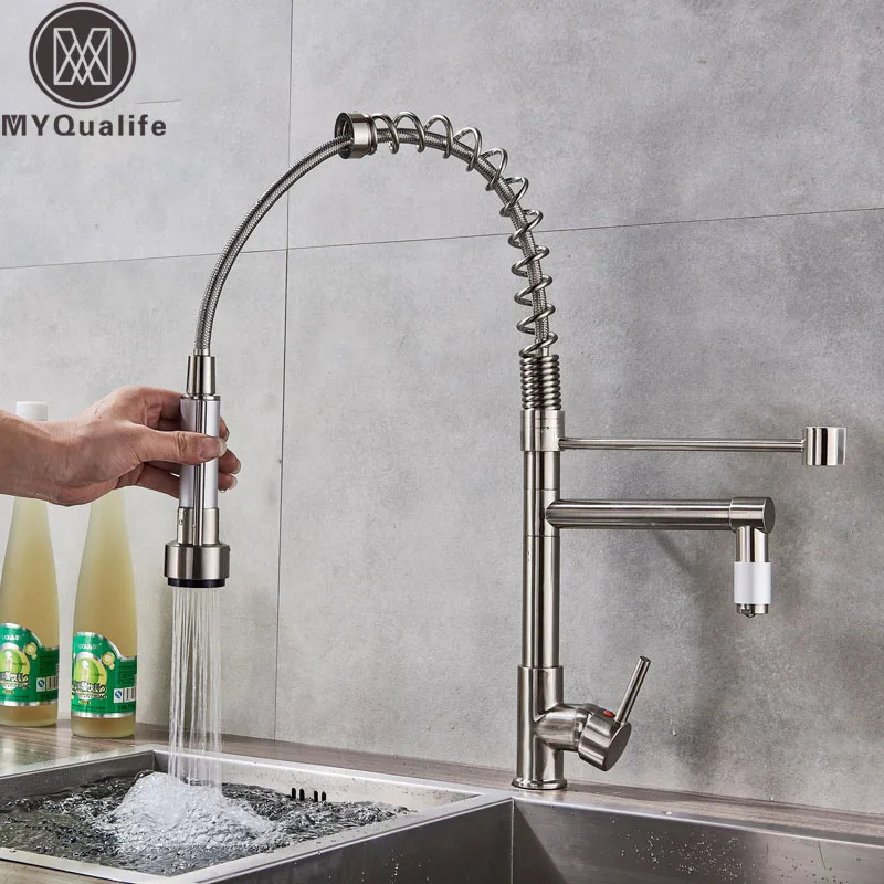 Comprar Chrome Pull Down Duplo Bico Torneira Da Pia Da Cozinha Primavera Swive Bico Único Punho Quente E Fria Pia Da Cozinha Torneira Misturadora de Cozinha tap Baratas Online Preço.