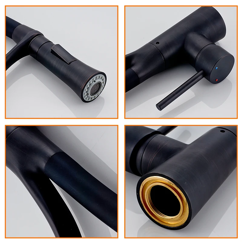 Comprar Quyanre Preto LED ORB Torneira Da Cozinha Pull out Pulverizador 360 Rotação Torneira Da Pia Único Punho Torneira Misturadora de Borracha Preta torneiras Baratas Online Preço
