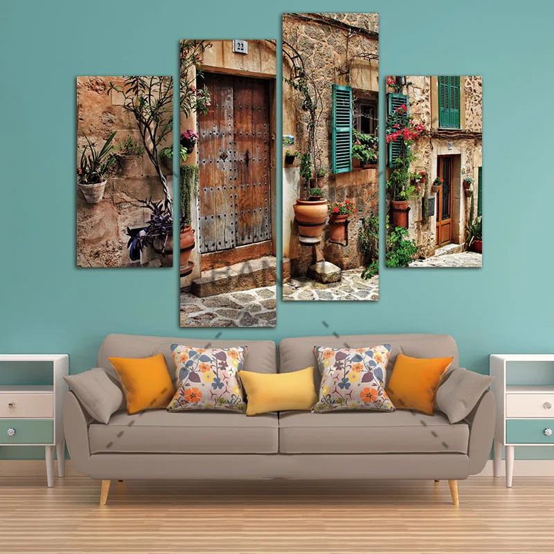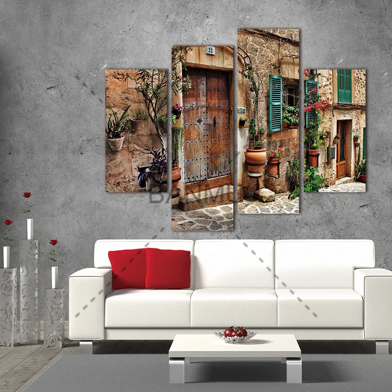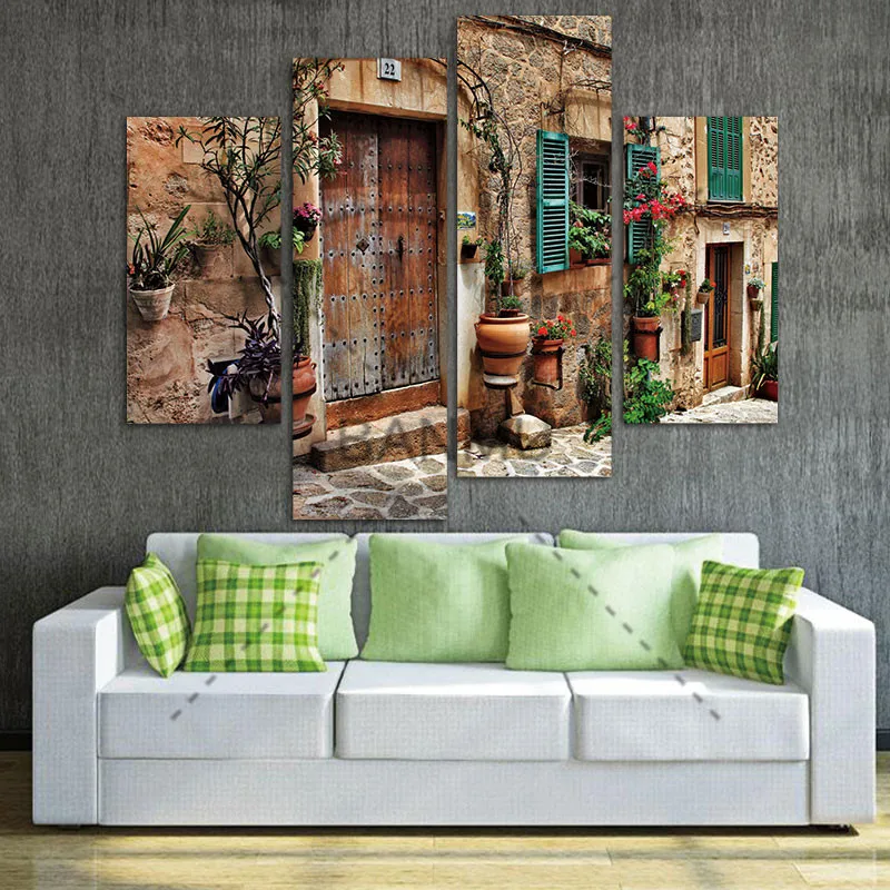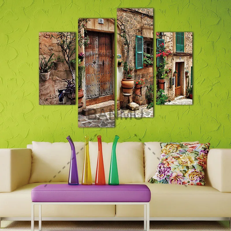 Comprar 4 Painel de Arte Da Parede Ruas De Cidades Mediterrâneo Antigo Flor Porta Janelas de Arquitetura Pintura Sobre Tela Pictures Para Home Decor Baratas Online Preço.
