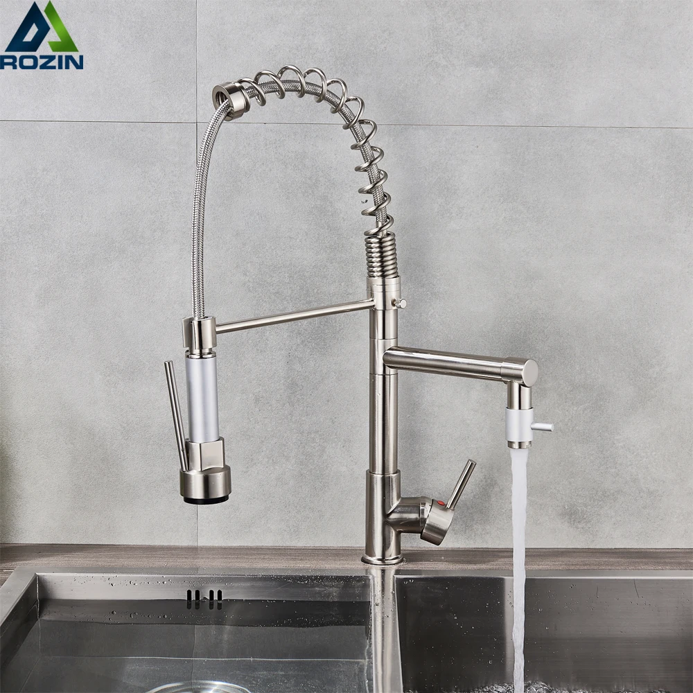 Comprar Níquel escovado Torneira Da Cozinha Da Mola Lateral Giratória Pulverizador Dupla Bico Misturador Da Cozinha Torneira Da Cozinha Pia Torneira Rotação de 360 Baratas Online Preço.