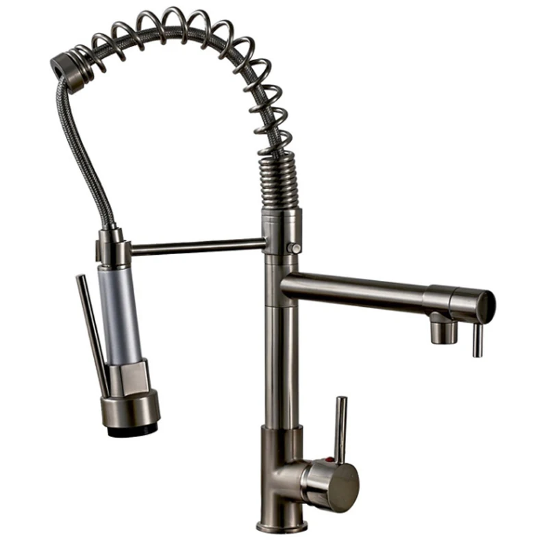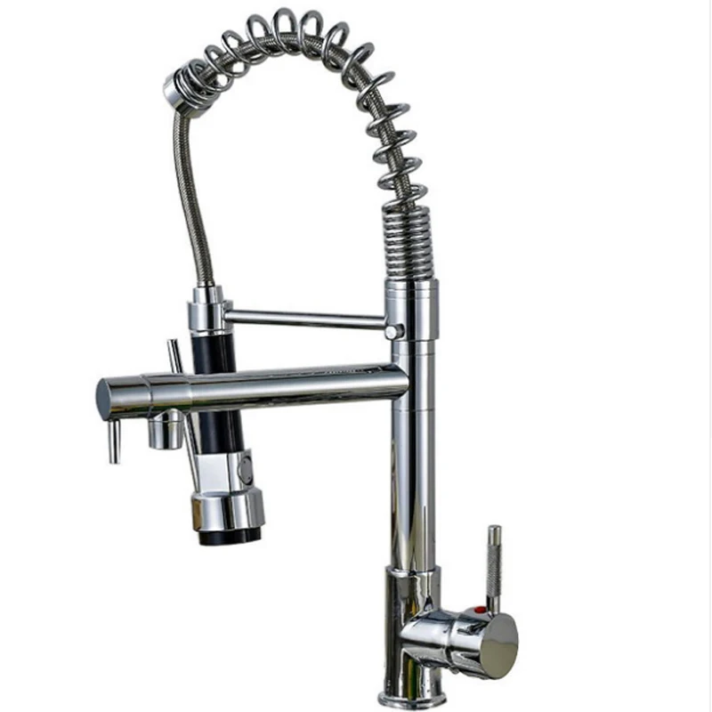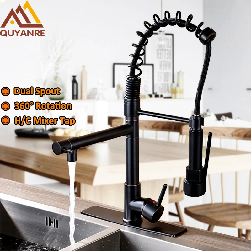 Comprar Preto cromado Primavera Pull Down Torneira Da Cozinha Dupla Bicos 360 Swivel Handheld Chuveiro Misturador Da Cozinha Torneira de Água Quente Frio 2 Tomada torneiras Baratas Online Preço.