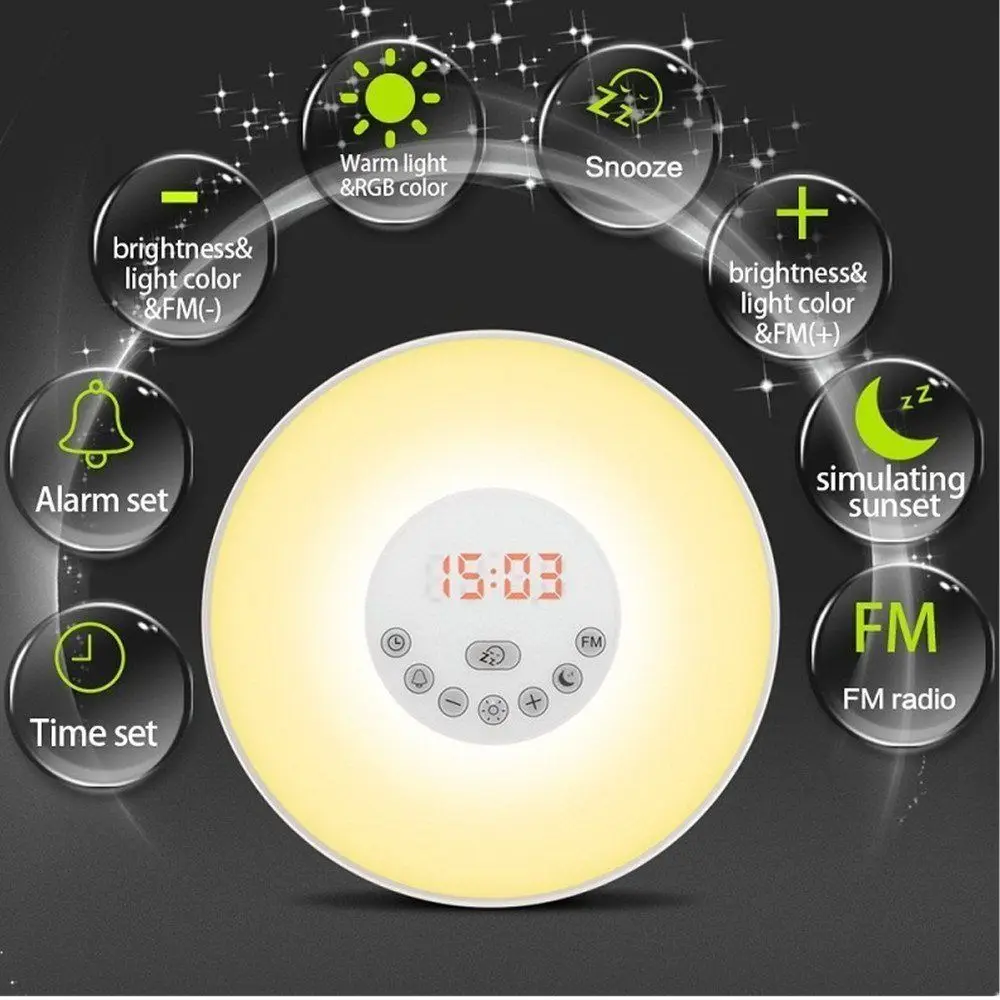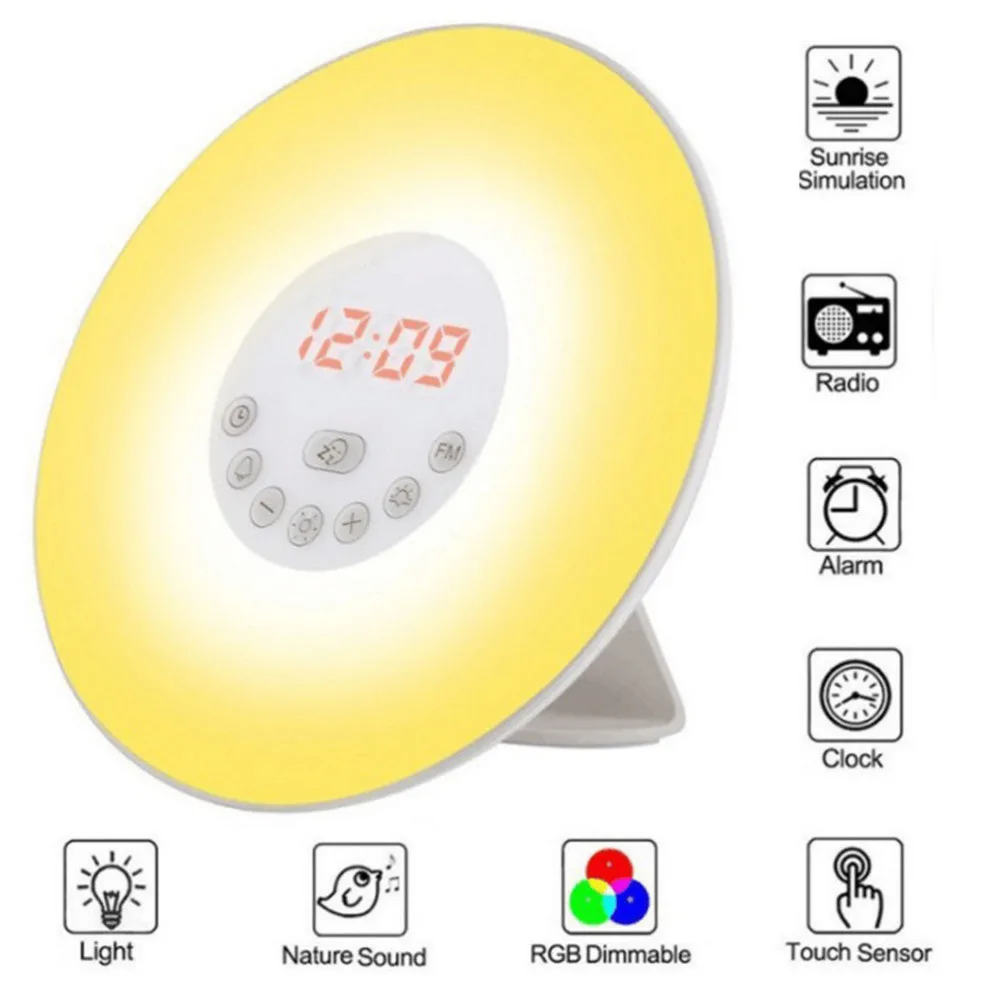 . Melhor 7 Mudança de Cor Do Nascer Do Sol Digital Sensor de Toque Despertador Wake up Light Snooze Cabeceira Relógio Despertador Com Rádio FM Lâmpada atmosfera Barato Online Preço.