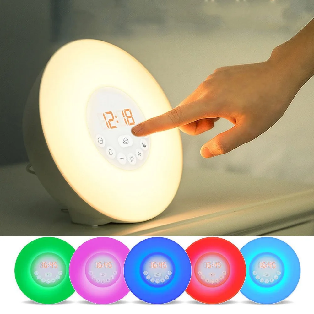 Comprar 7 Mudança de Cor Do Nascer Do Sol Digital Sensor de Toque Despertador Wake up Light Snooze Cabeceira Relógio Despertador Com Rádio FM Lâmpada atmosfera Baratas Online Preço.