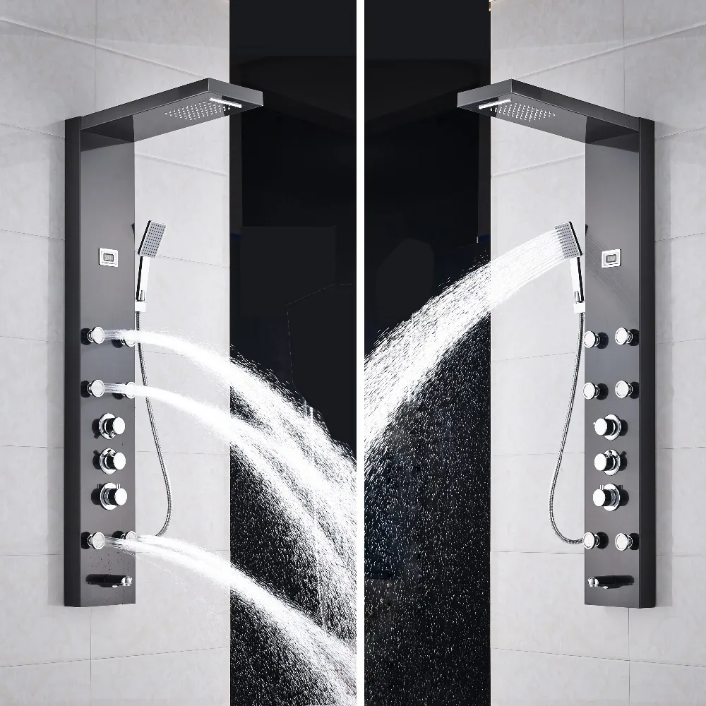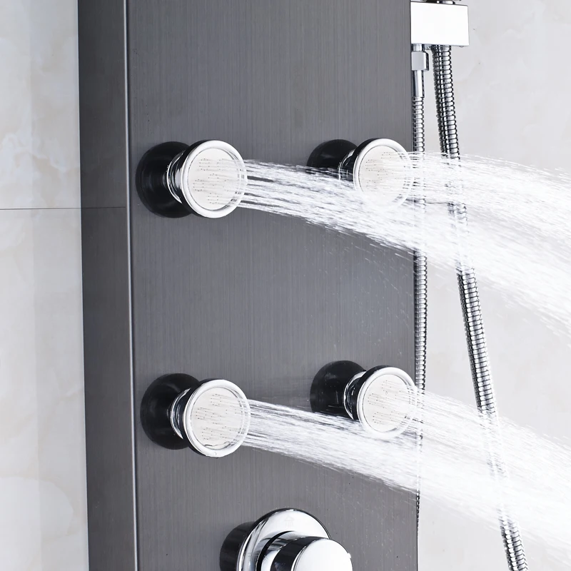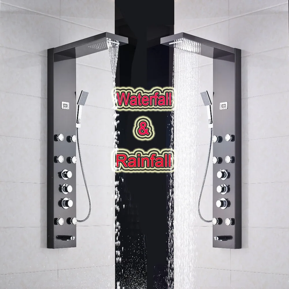 Comprar Cachoeira 6 pc Massagem Jatos Chuva Coluna de Duche Termostática Misturador Do Chuveiro Torneira Torre W Chuveiro de Mão Banheira Bico Preto painel Do chuveiro Baratas Online Preço.