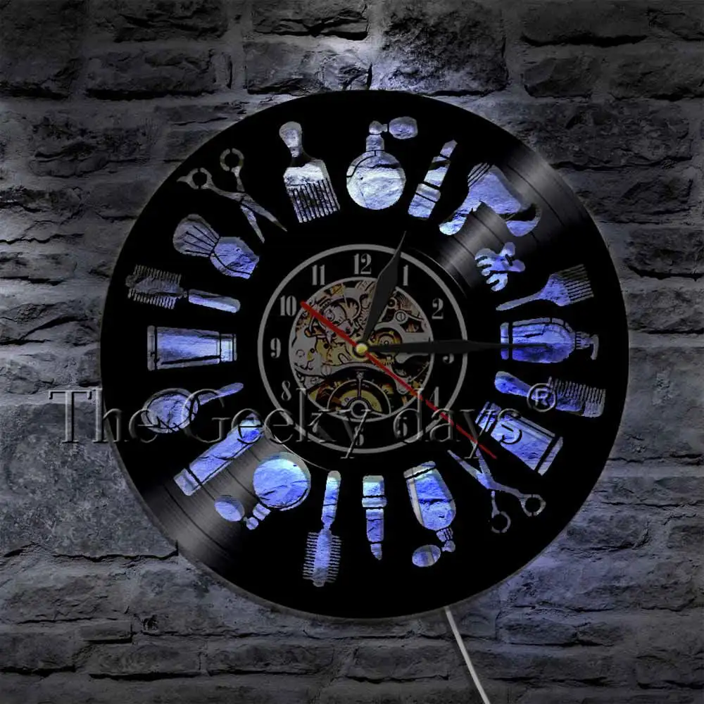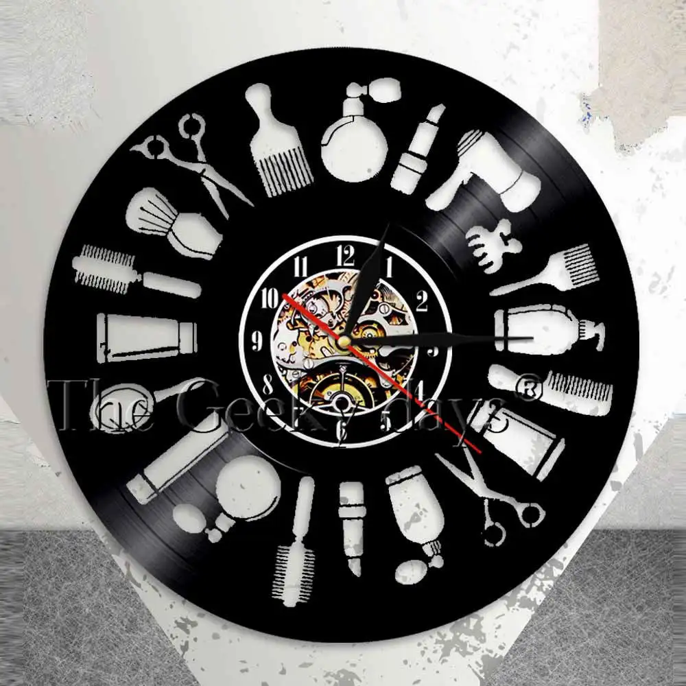 Comprar Ferramentas de cabeleireiro Logotipo Disco de Vinil Relógio de Parede Equipamentos de Cabeleireiro do Salão de Beleza Barber Shop Decor Handmade Da Parede Da Arte Relógio Baratas Online Preço