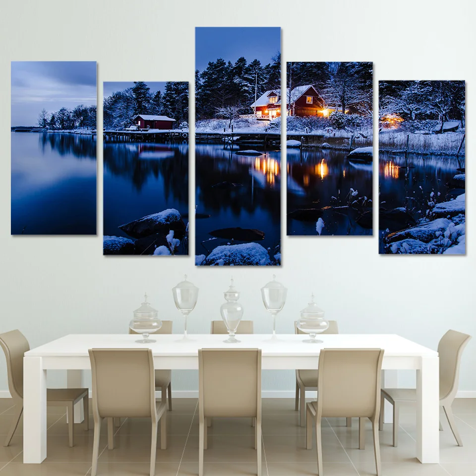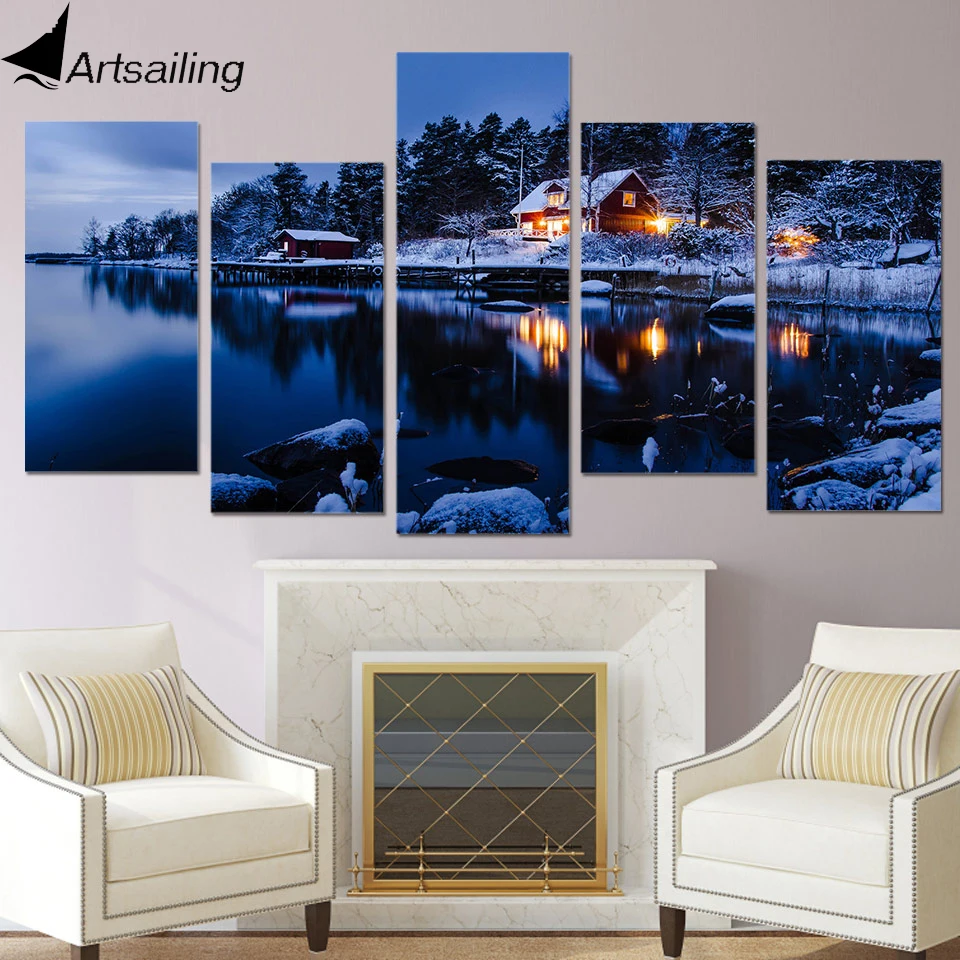 Comprar HD Impresso lago cenário da casa da neve do inverno 5 peças Grupo decoração da sala de Pintura imprimir imagem do cartaz da lona Frete grátis ny 715 Baratas Online Preço.