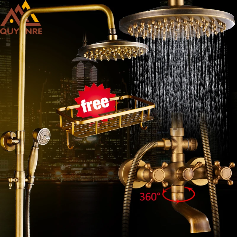 Comprar Quyanre Torneiras de Chuveiro De Bronze Antigo Conjunto 8 Commodity Prateleira Do Chuveiro Rainfall Handle Dual Tap Mixer Banheira Banho de Bica Giratória chuveiro Baratas Online Preço.
