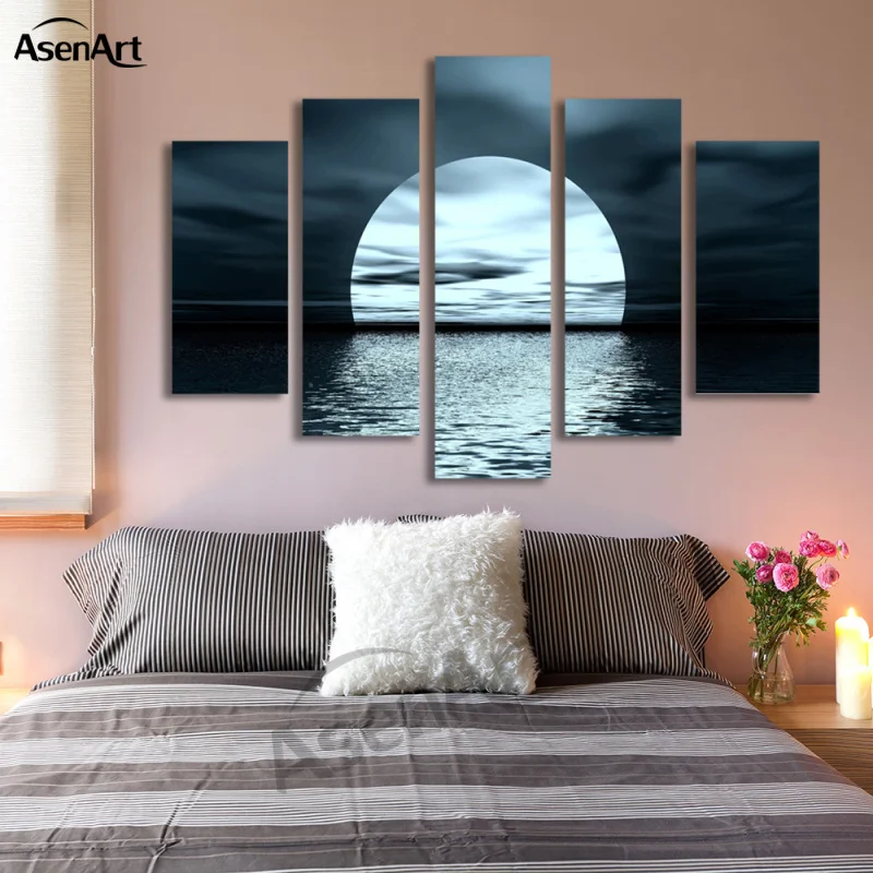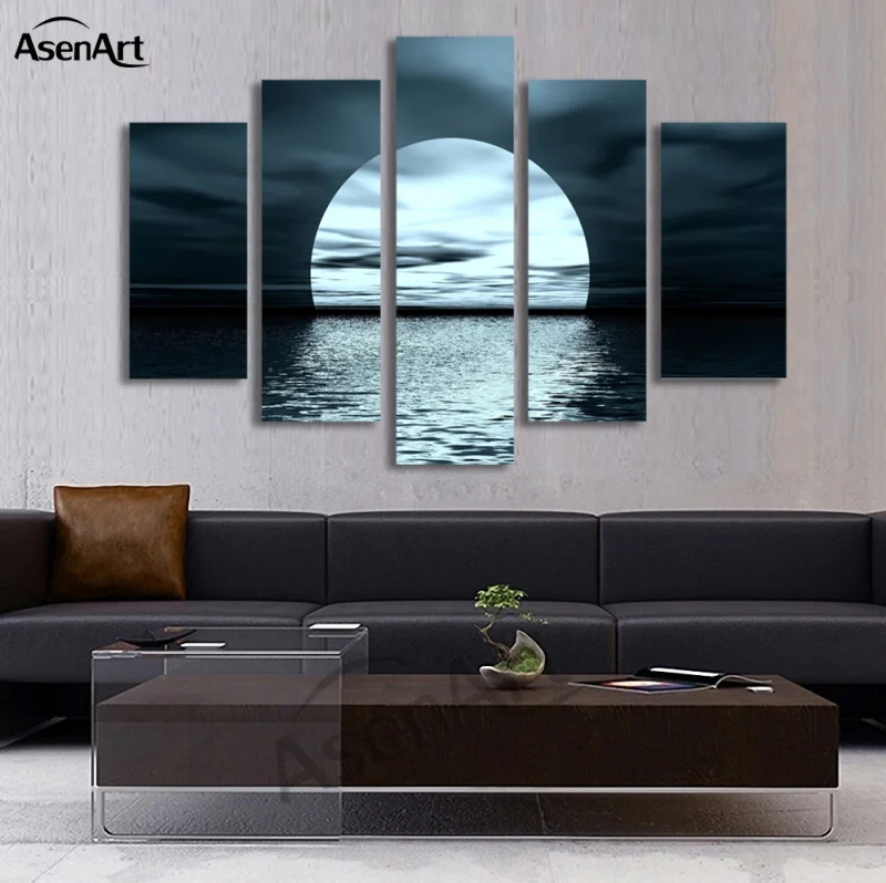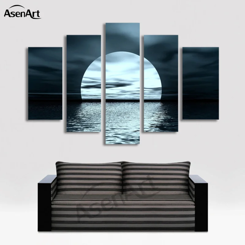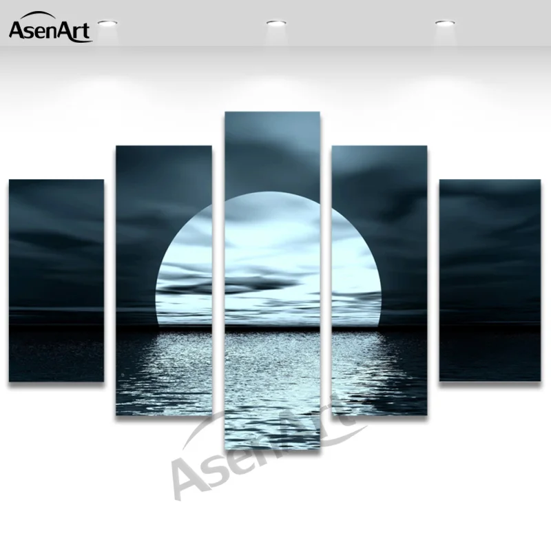 Comprar Painel 5 Imagem Da Lua Noite Mar Pintura de Paisagem para Sala de estar Moderna Casa Decoração Da Parede Cópias Da Lona de Arte Sem Moldura Baratas Online Preço