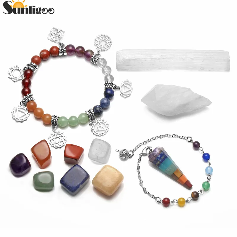 Comprar Sunligoo Kit 7 Cristal Tombado Pedras de Cura Selenito Stick Clear Quartzo Geode Cluster Chakra Pendulum Chakra encantos Pulseira Baratas Online Preço.